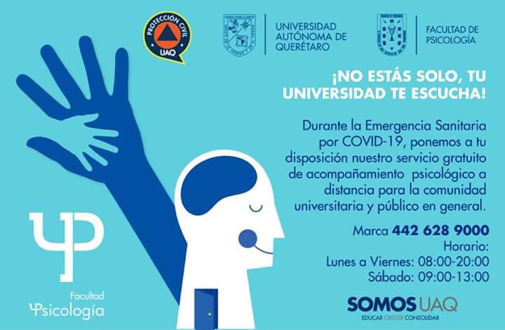 QUERÉTARO, QRO.- Con el propósito de minimizar el impacto psicológico a causa de la contingencia que establece el ¡Quédate en casa!, y que presupone el aislamiento y distanciamiento social, la Universidad Autónoma de Querétaro (UAQ) y la Facultad de Psicología (FΨ) pusieron a disposición de la comunidad universitaria y de la sociedad queretana en general, el programa gratuito de Acompañamiento Psicológico Telefónico durante la emergencia sanitaria por el COVID-19, por medio del teléfono: 442- 628- 9000, en un horario de atención de 8:00 a 20:00 horas, de lunes a viernes; y de 9:00 a 13:00 horas, los sábados.